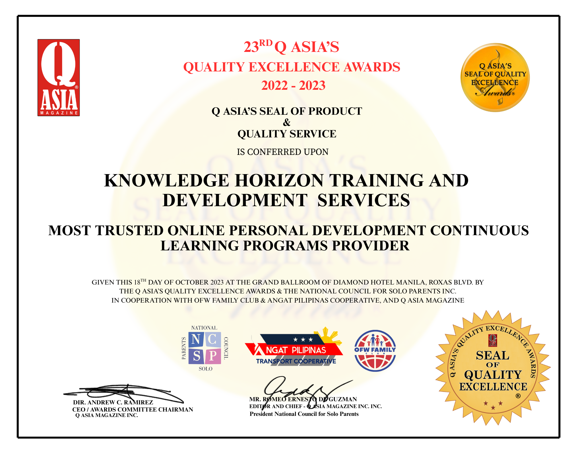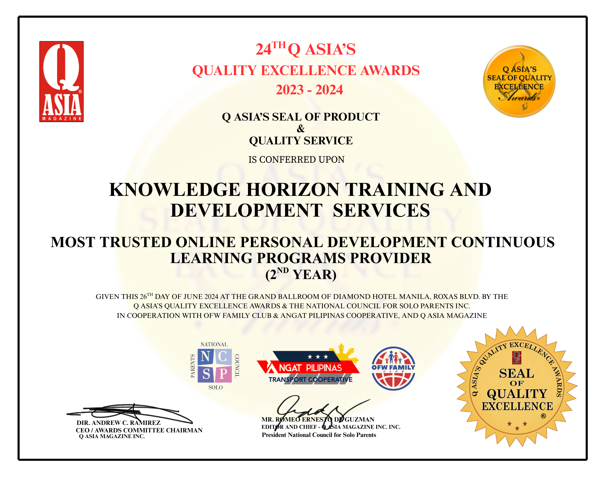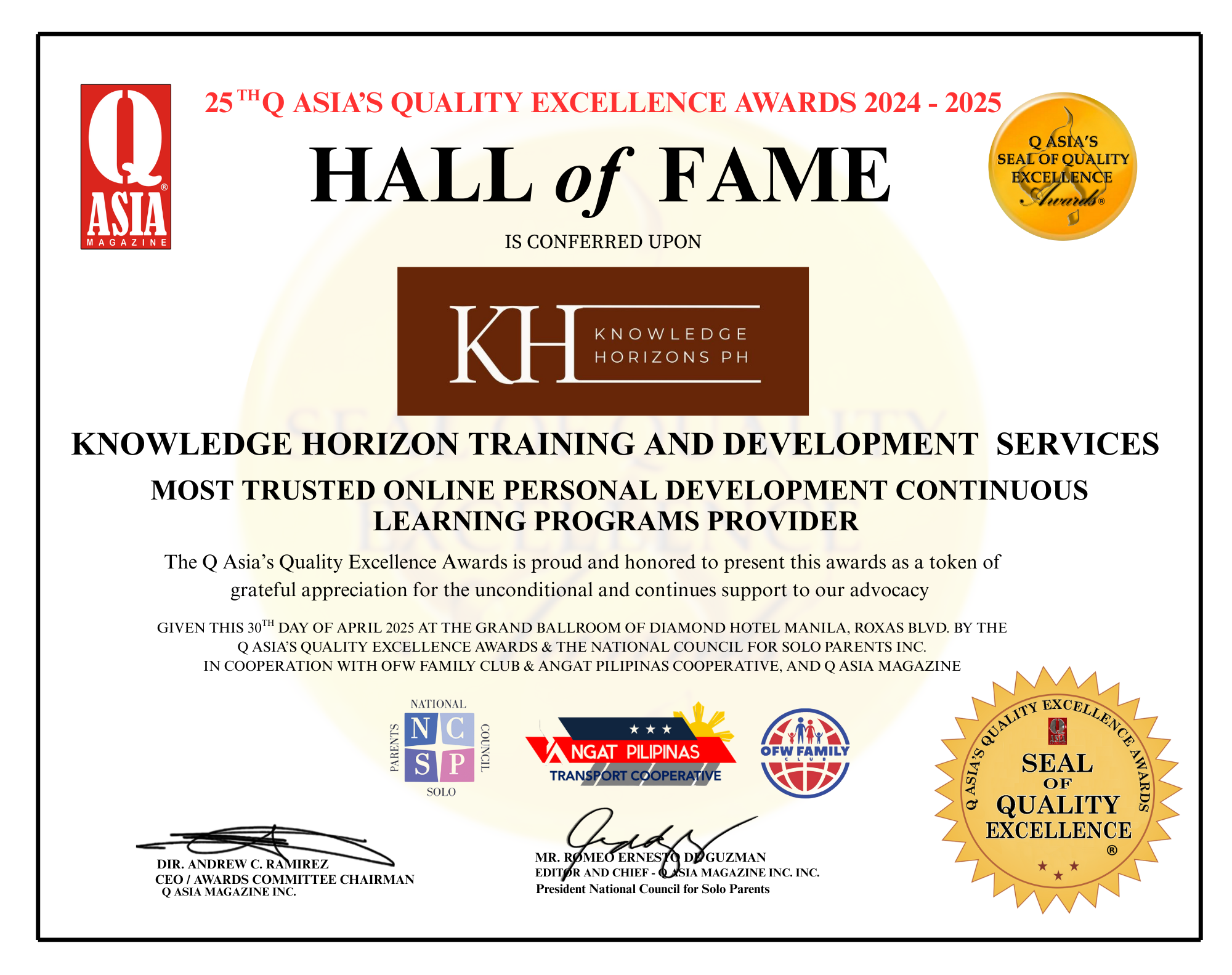 At Knowledge Horizons PH, we empower Filipino professionals through practical, high-quality online training designed for real workplace success. Our flexible self-paced and live online programs help you build relevant skills, earn certificates immediately, and grow with confidence. Whether you’re advancing your career or strengthening your credentials, we make learning accessible, purposeful, and impactful. Now anytime, anywhere!