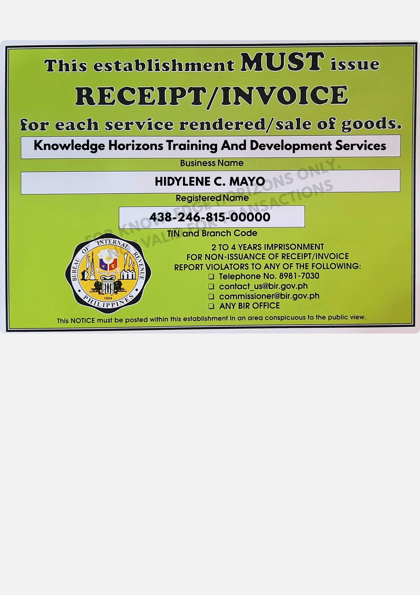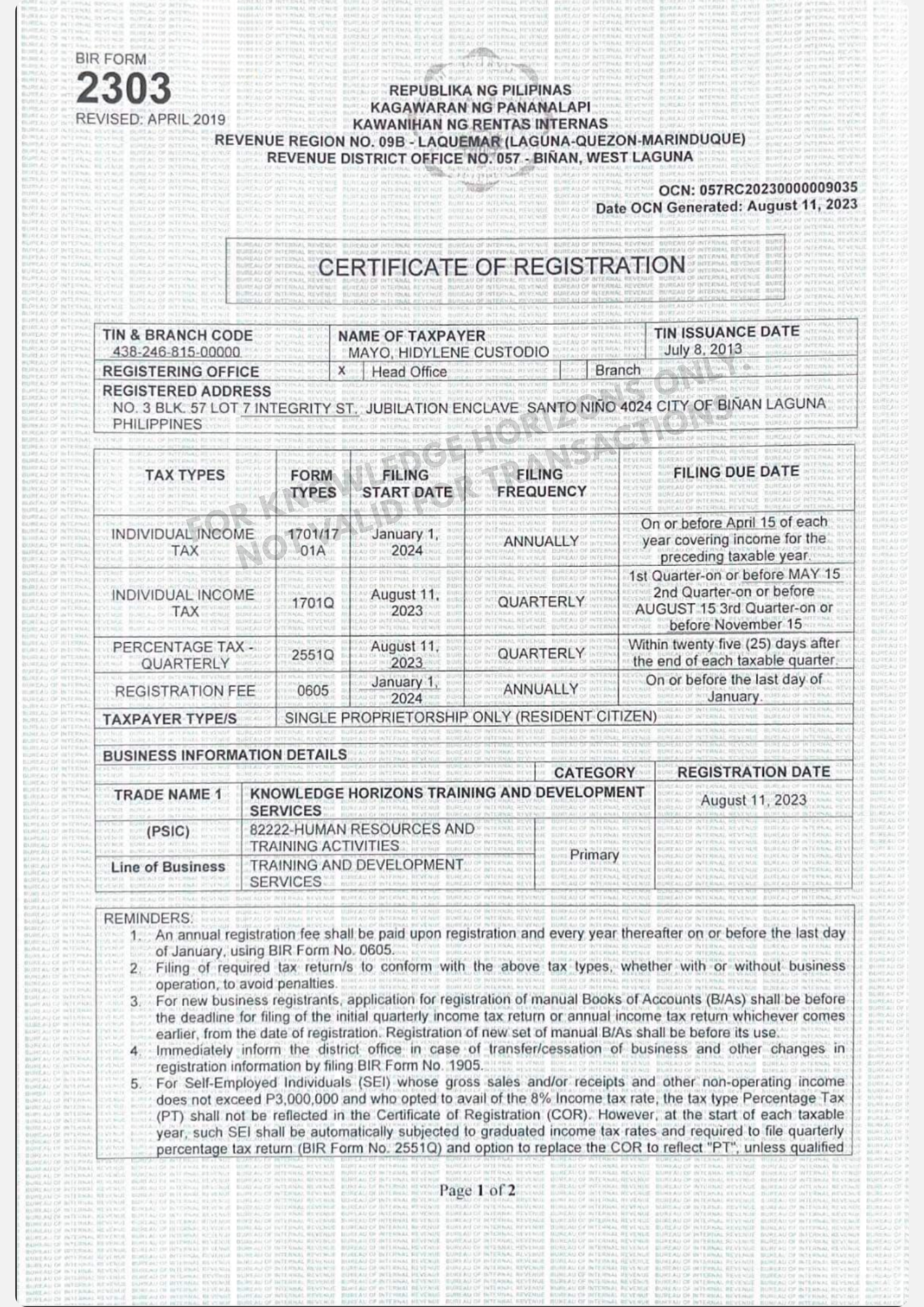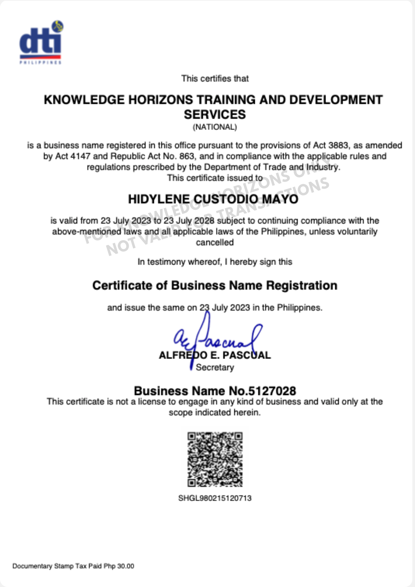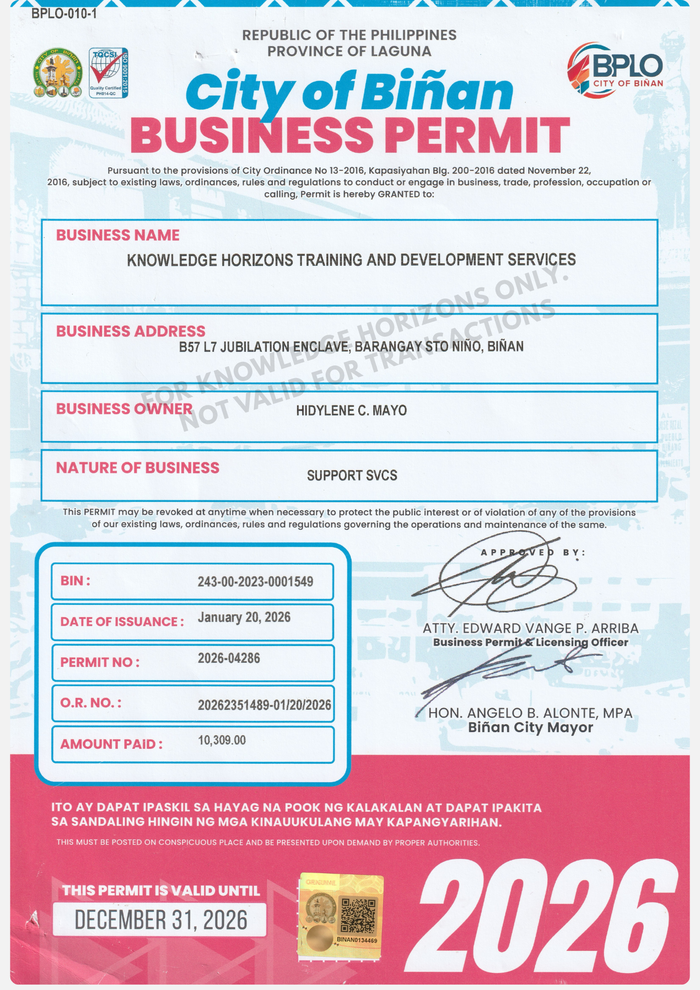 Knowledge Horizons PH is a duly registered Training and Development Service Provider with DTI, BIR, and local government permits. We operate in compliance with Philippine regulations to ensure legitimacy, transparency, and trusted professional learning services.