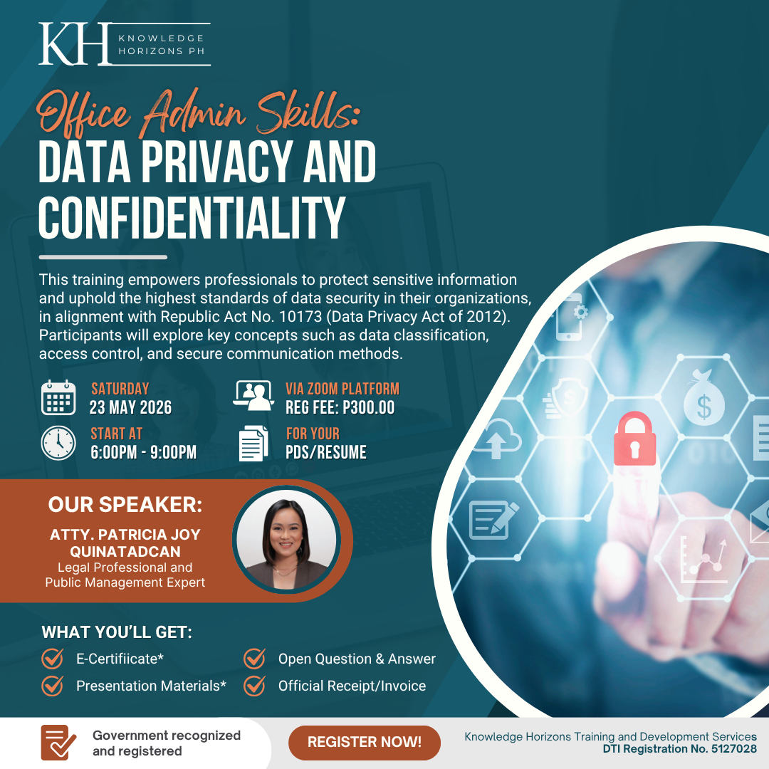 This program covers the role of the National Privacy Commission, compliance and registration requirements, and best practices for managing data responsibly. By the end of the training, attendees will have the skills to protect sensitive information, reduce privacy risks, and ensure confidentiality in modern office environments.